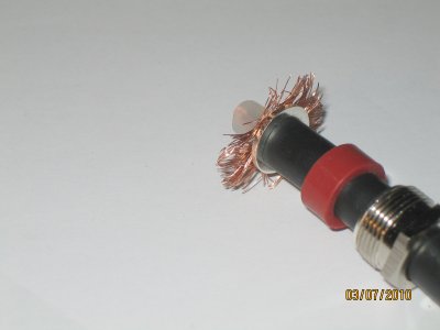 kaapelin ulkokuorta vasten ja taita punottu kuparivaippa prikkaa vasten 90 asteen kulmaan kaapeliin nähden. |