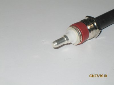 kontaktiprikka keskieristeen ja punotun vaipan väliin, niin pitkälle kuin prikka menee. Muotoile punottu vaippa tasan prikan kanssa ja siirrä kumitiiviste prikkaa vasten. |
